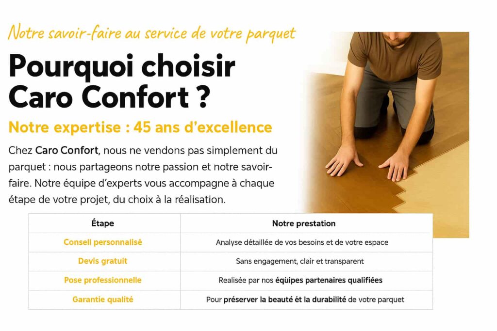 Le parquet transforme votre espace en lui conférant une âme, une histoire et une authenticité inégalées. Que vous rêviez d’un parquet chêne massif traditionnel, d’un contrecollé moderne, d’un stratifié pratique ou d’une solution vinyle innovante, l’équipe Caro Confort vous accompagne avec expertise et passion.